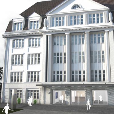 Die Neugestaltung der denkmalgeschützten Fassade und des Vorplatzes wird durch die großzügigen Öffnungen im Foyer fortgesetzt.
