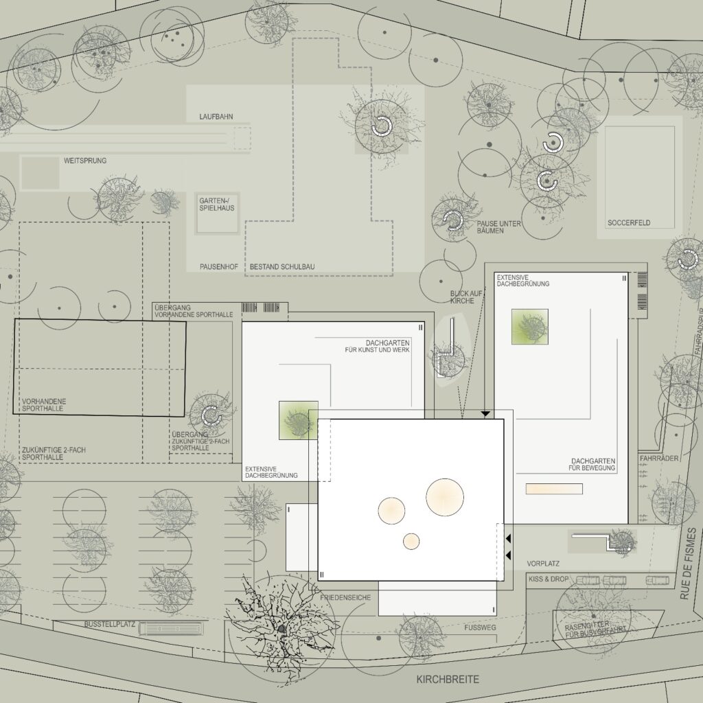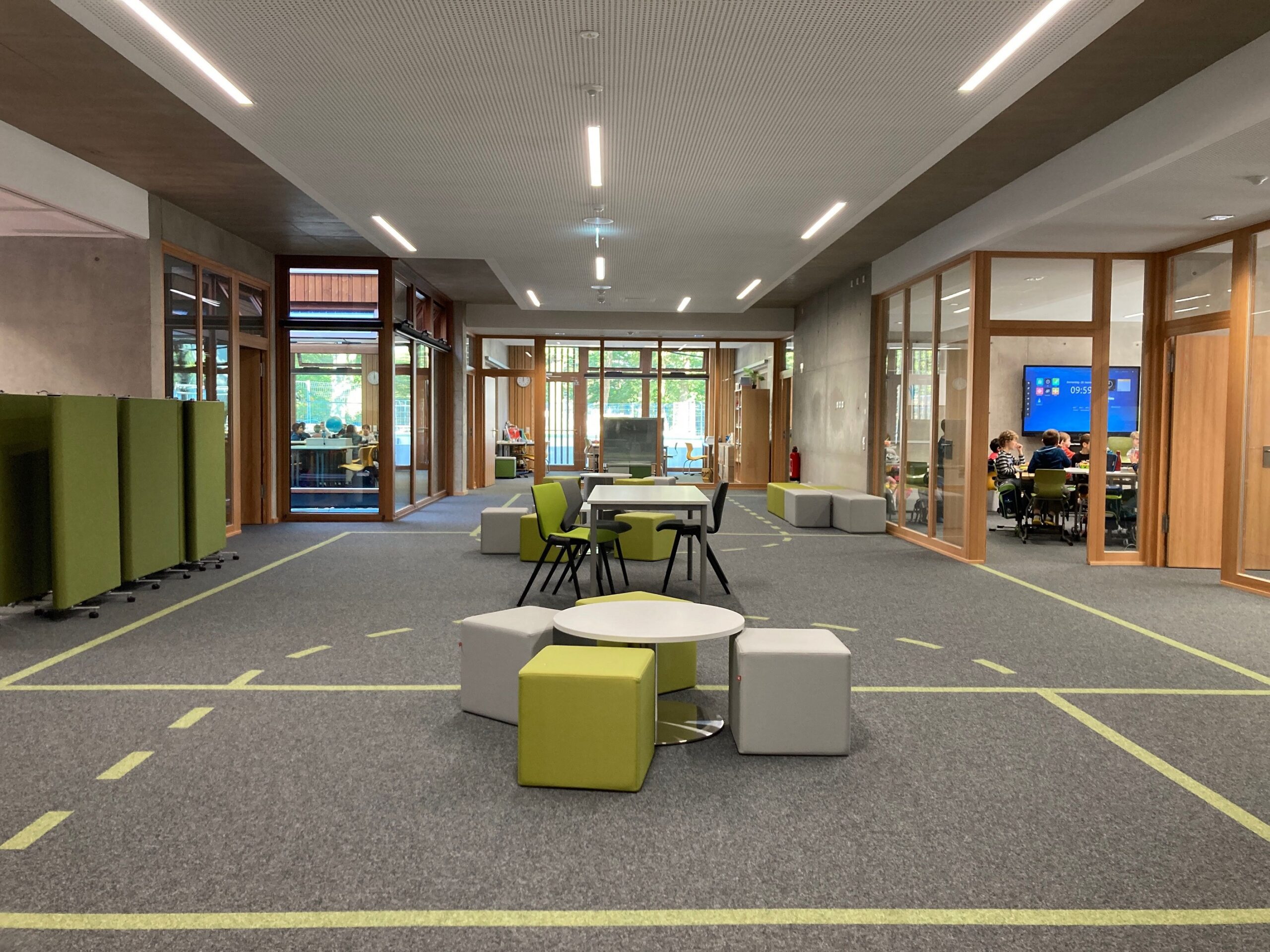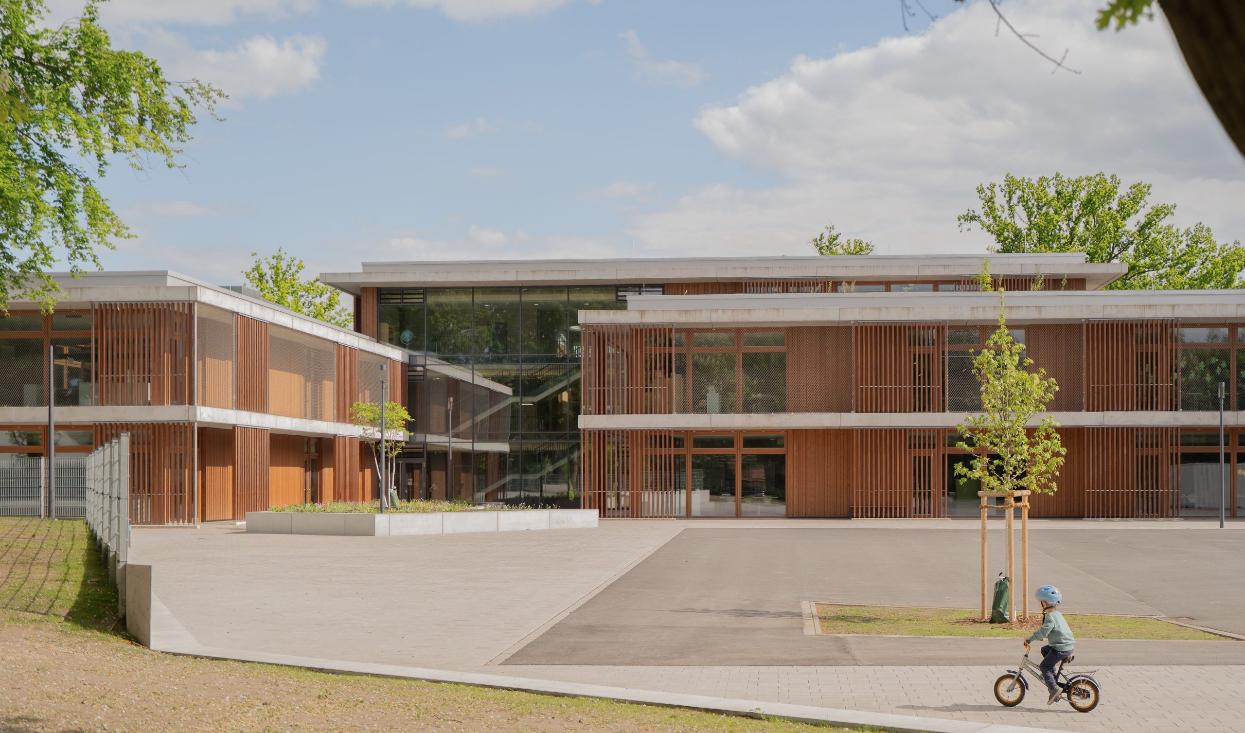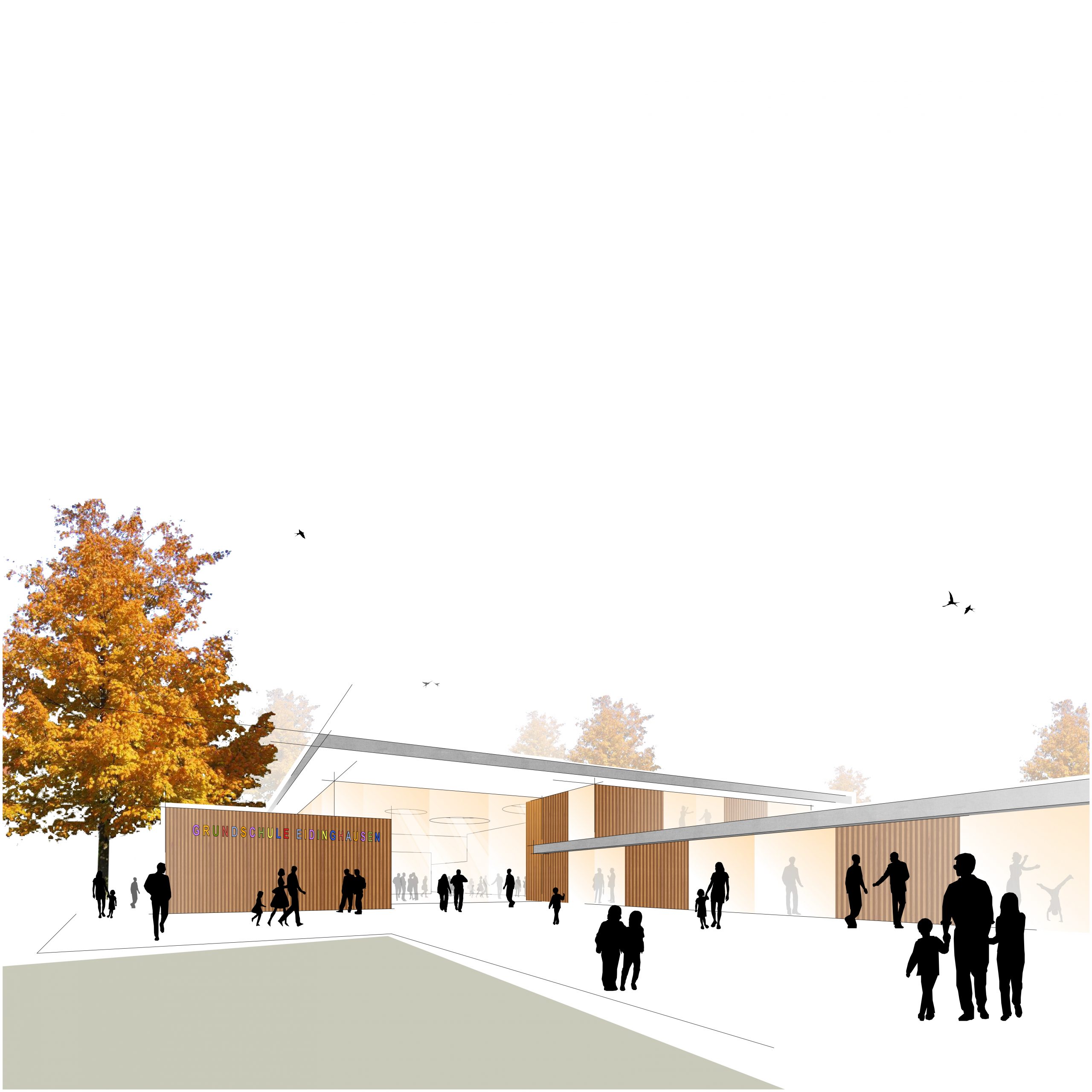 Durch die Fassade aus Holz mit vielen transparenten Bereichen entsteht ein moderner Baukörper. Durch die Anordnung der Baukörper entstehen helle Räume mit vielen Sichtbeziehungen und kleinen Innenhöfen.