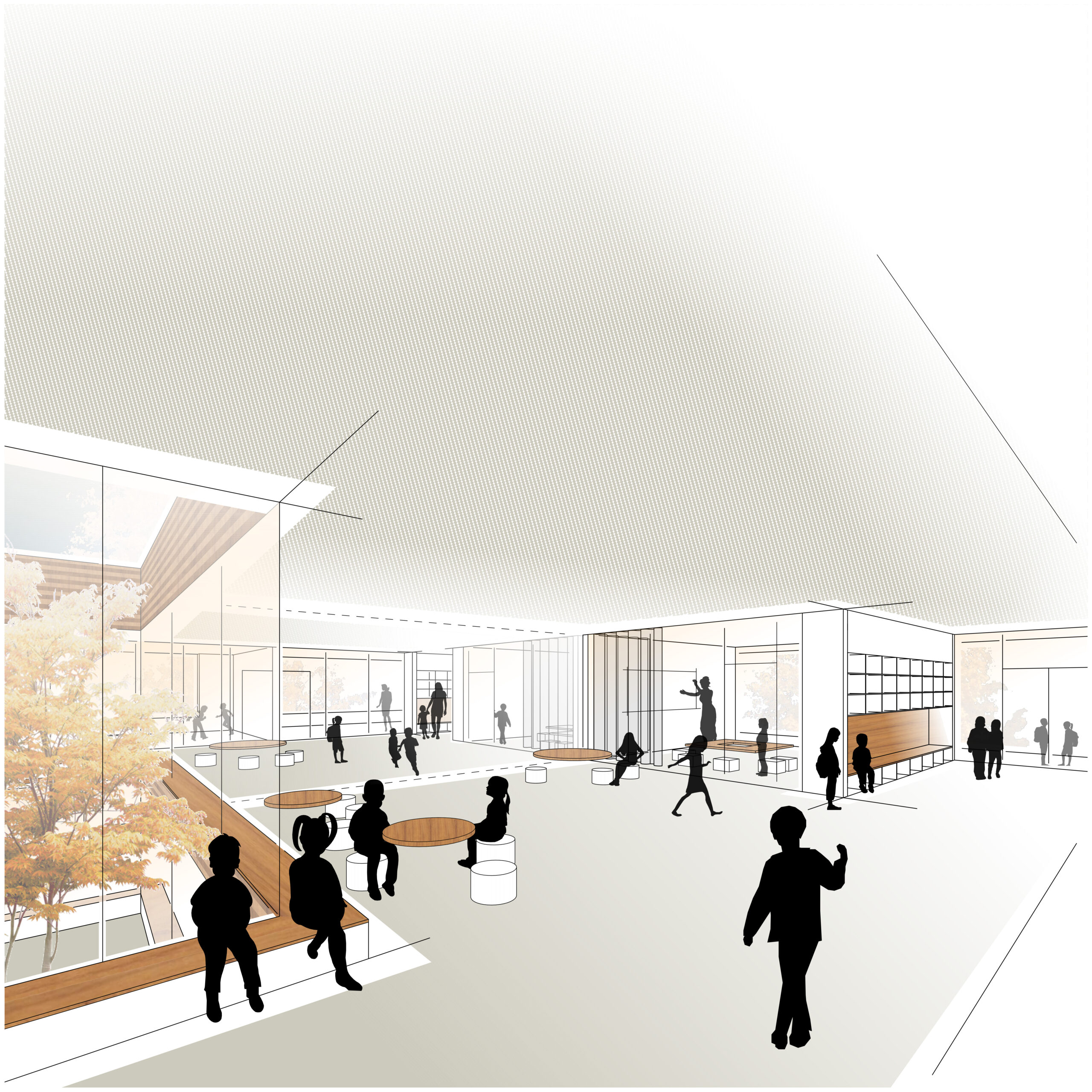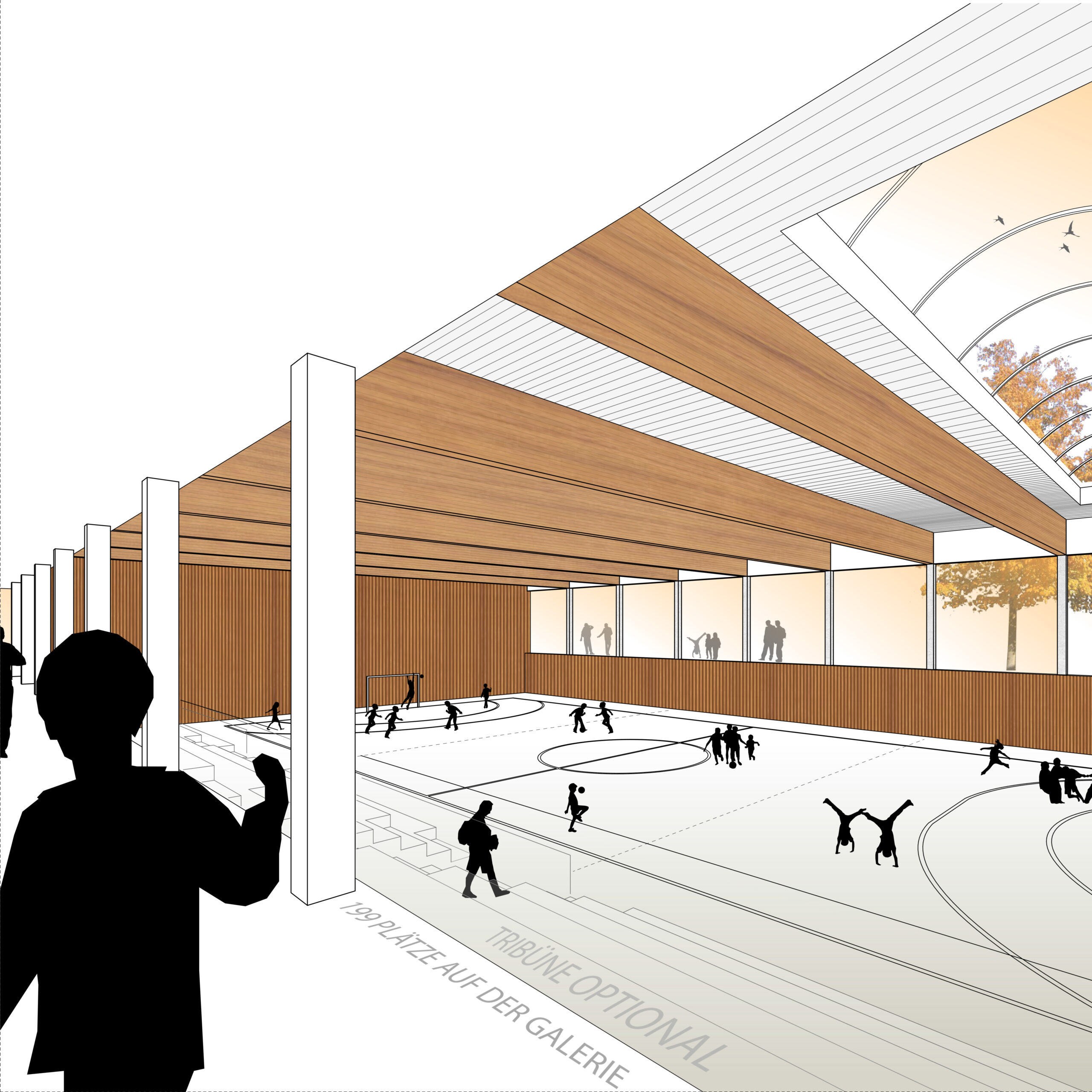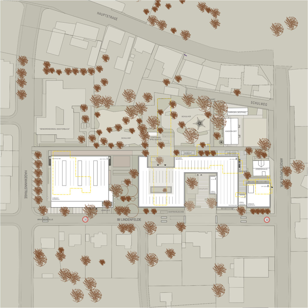 Der Neubau der Grundschule umfasst vier Cluster mit Lernmitte und Differenzierungsräumen für ein individuelles und kindgerechtes Lernen. Die Fachräume ermöglichen durch angrenzende Außenbereiche das praxis- und naturnahe Lernen. Das Herz der Schule bildet die Mensa mit einer ebenfalls nach Außen orientierten Bühne. Der Baukörper trennt den Schulhof von der Straße, wodurch eine private und öffentliche Zone entsteht. Im privaten Bereich öffnet sich der Baukörper mit den Clustern zum Schulhof und ermöglicht ein sicheres Spielen. Im öffentlichen Bereich öffnet er sich mit der Mensa zur Straße. Es entsteht eine repräsentative Eingangssituation, die durch ihre Platzform geschützt ist.