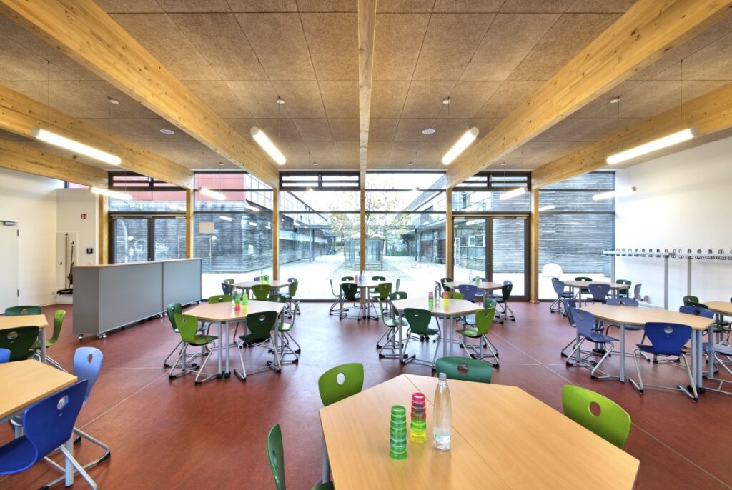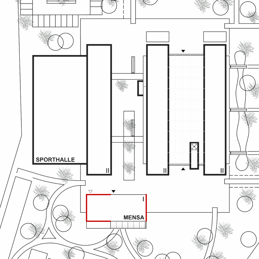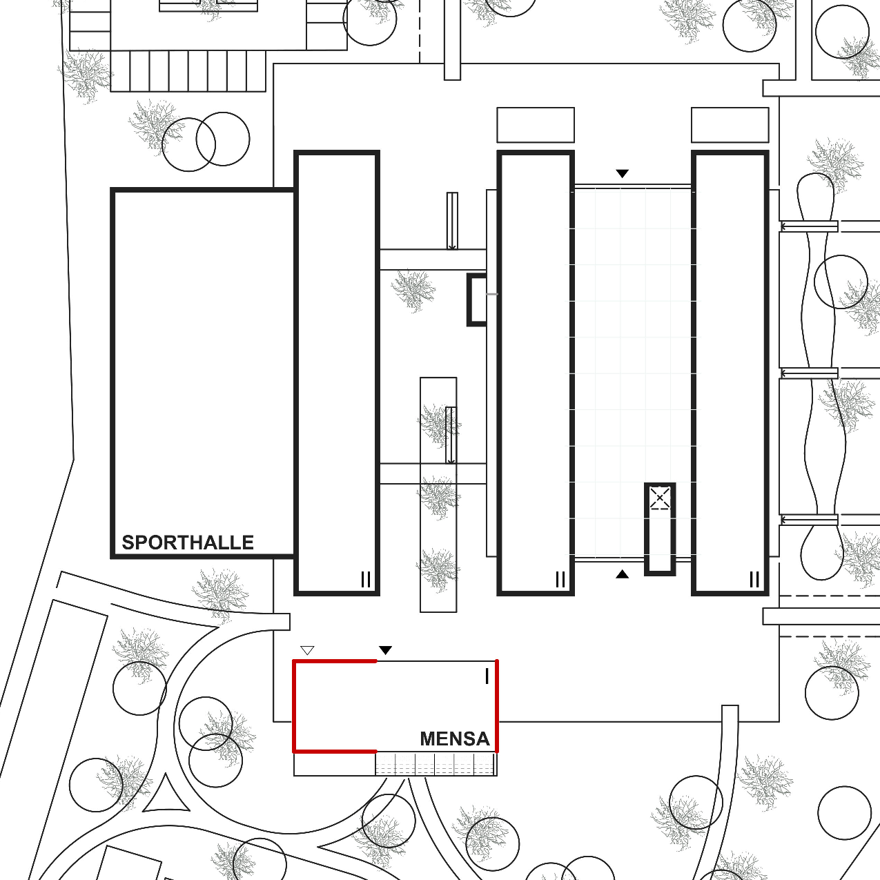 Im Laufe der Standortentwicklung ist der Ganztagsbereich auf den Umkleiden der Sporthallen hinzugekommen. Der aktuelle Baustein in dem Ensemble ist das Mensagebäude, welches die geradlinige Gebäudestruktur mit einem multifunktionalen Holzbau erweitert.