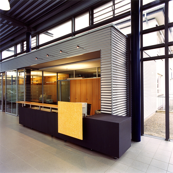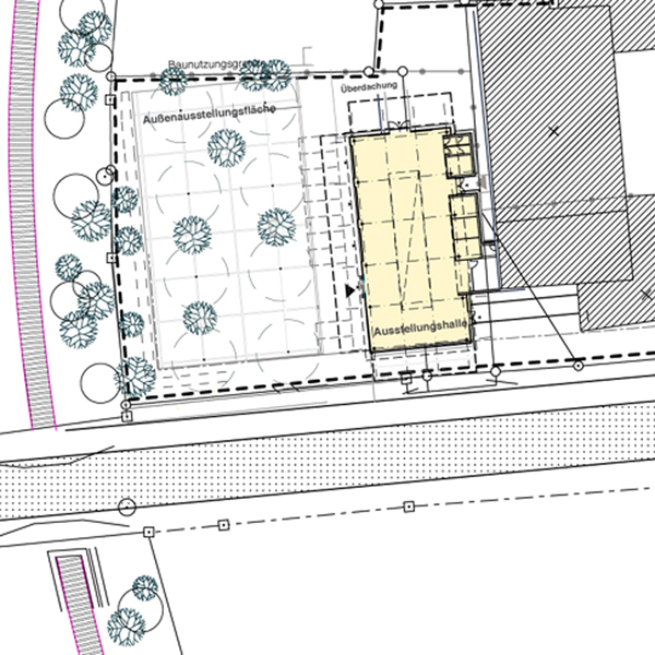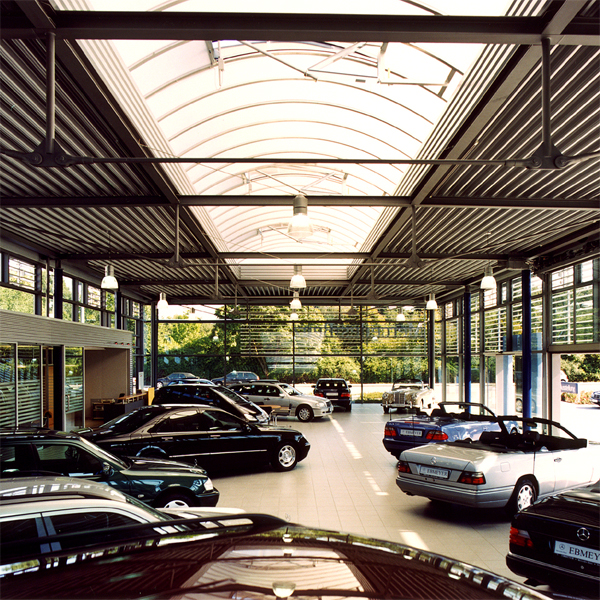 Die verglaste Ausstellungshalle an der Bielefelder Straße präsentiert die Fahrzeuge in einer repräsentativen Art und Weise. Innen- und Außenbereich sind optisch stark verbunden.   Der Screen aus Sonnenschutzlamellen gibt dem Gebäude eine technische Ausstrahlung und schützt das Gebäude vor zu starker Sonneneinstrahlung bei weitestgehender Transparenz.