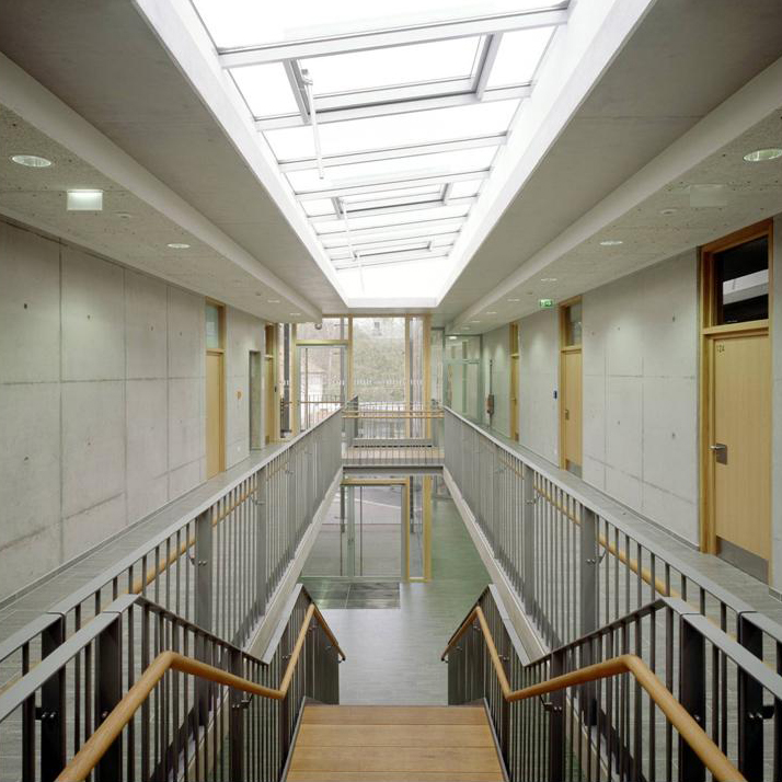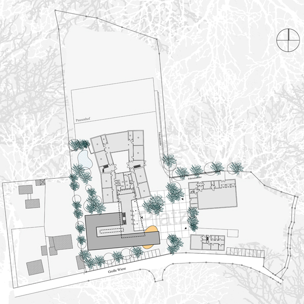 Der gefasste Vorplatz dient als Verteiler für die Anlage. An ihm ist der neue Haupteingang gelegen, der ergänzte Baukörper schließt das o. g. Konzept.